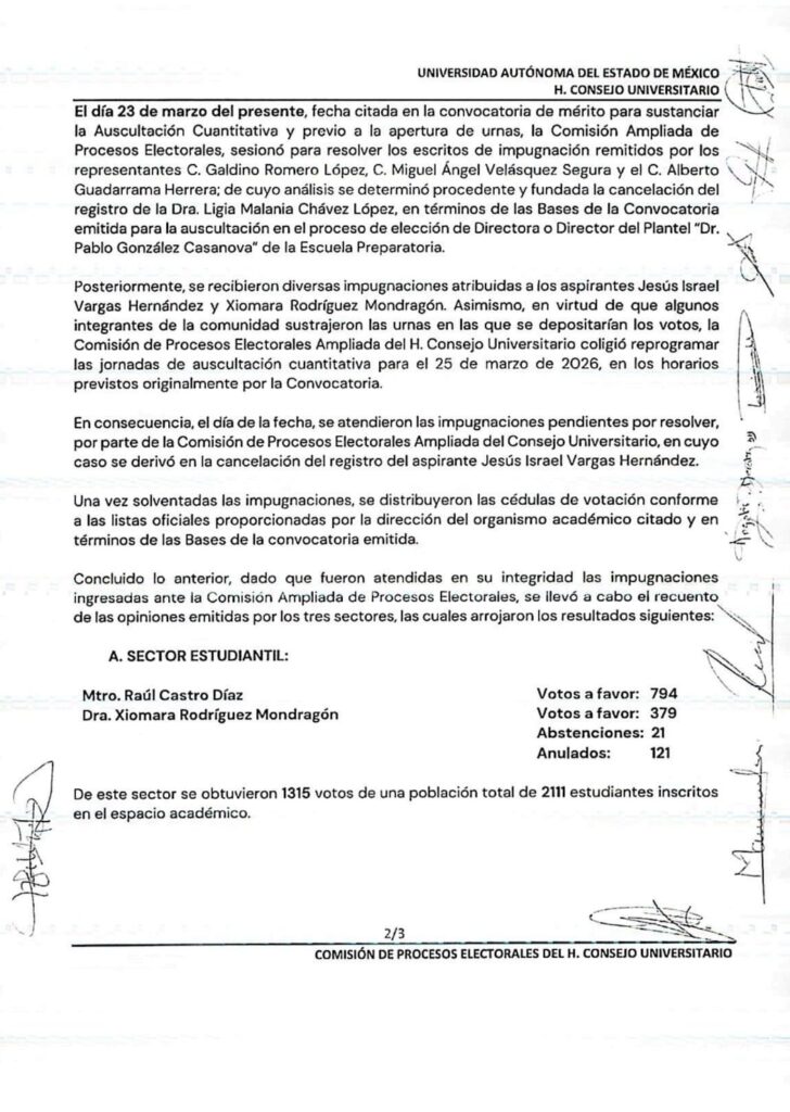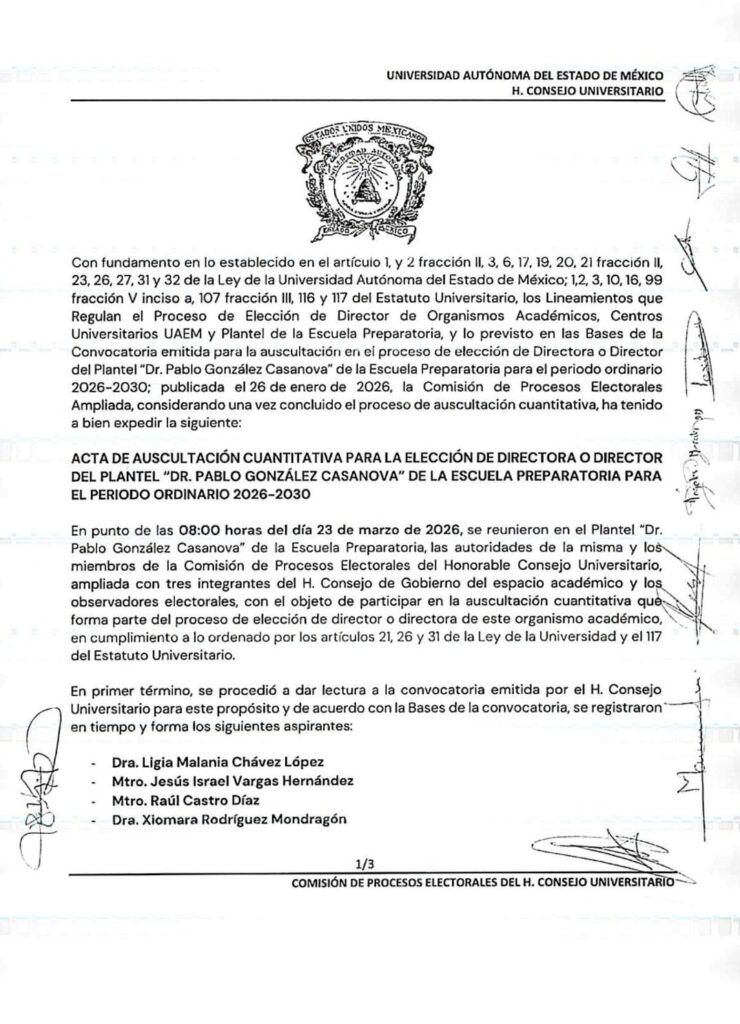 El proceso de elección de la dirección del plantel “Dr. Pablo González Casanova” de la Escuela Preparatoria de la Universidad Autónoma del Estado de México (UAEMéx) estuvo marcado por impugnaciones, cancelaciones de registros y hechos atípicos que obligaron a reprogramar la jornada de auscultación.